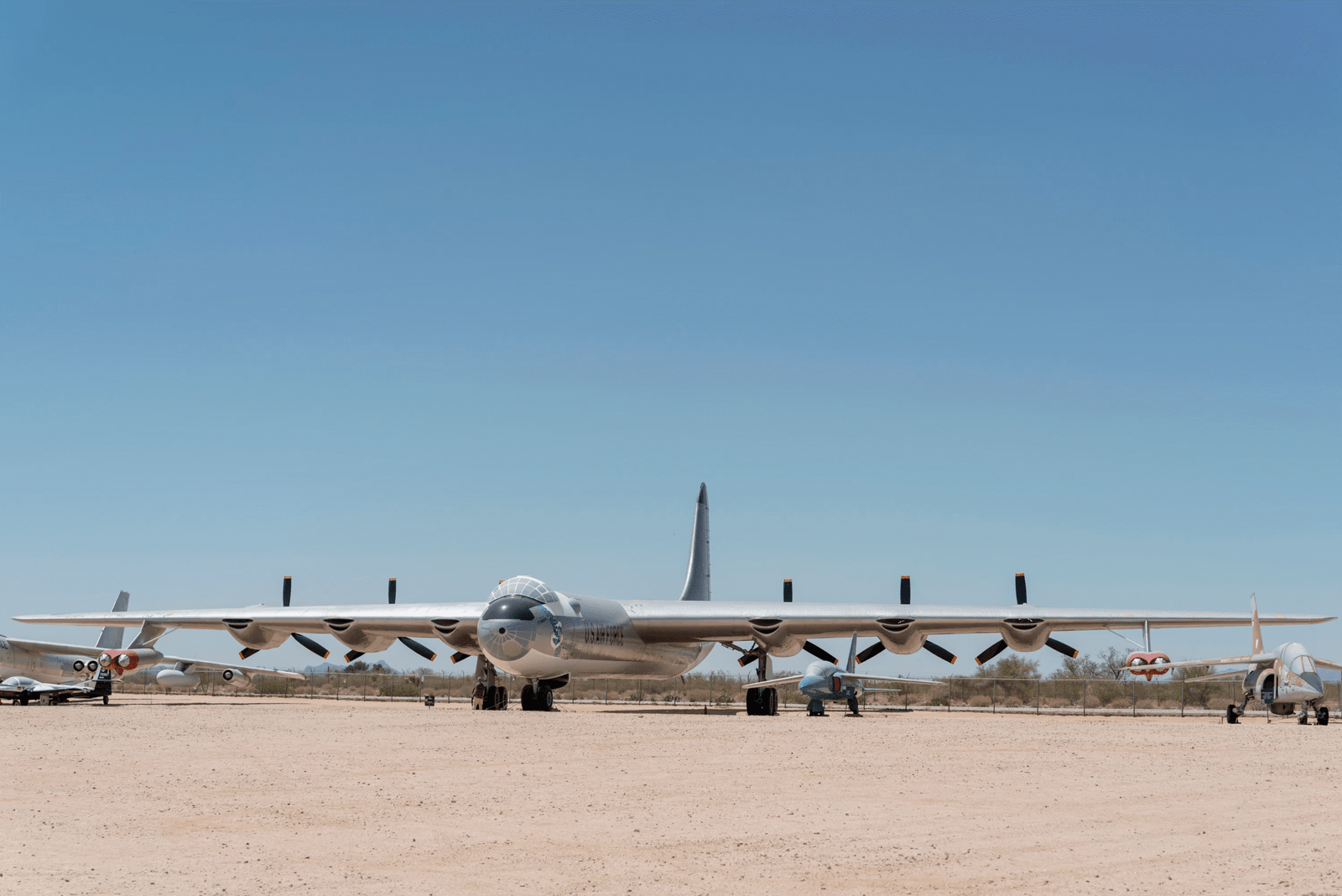 The same went for the propulsion system. At first, the aircraft had six Pratt & Whitney R-4360 radial piston engines, which were arranged as pushers, and the propellers were facing the rear. Four General Electric J47 jet engines were fitted later under the wings of the last versions, and the Peacemaker got the widely known nickname: “six turning, four burning.”