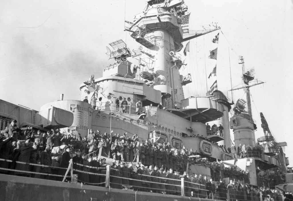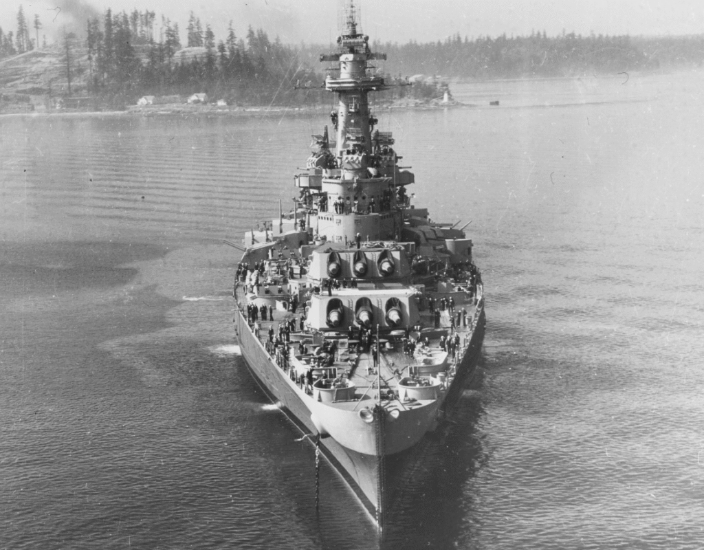 Assisting them were twenty 5-inch/38 caliber dual-purpose weapons, effective against both surface vessels and planes. She featured heavy armor, with a main belt as thick as 12 inches and an armored deck from 1.5 to 6 inches, meant to endure severe enemy fire. With steam turbines, Washington was capable of up to 28 knots, allowing her to keep pace with swift carrier groups and move around in combat.