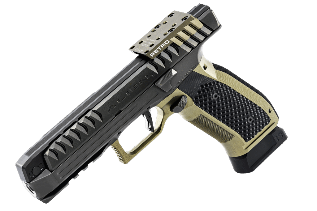 The evolution went on with the Alien Creator Evolution, with even more high-end parts such as DLC (diamond-like carbon) coatings, CNC-cut aluminum grip frames, and a reduced 3.5-pound trigger. These pistols are ready-to-go kits, including dry-fire training aids, optics-ready slides, and all the bells and whistles a serious shooter could desire.