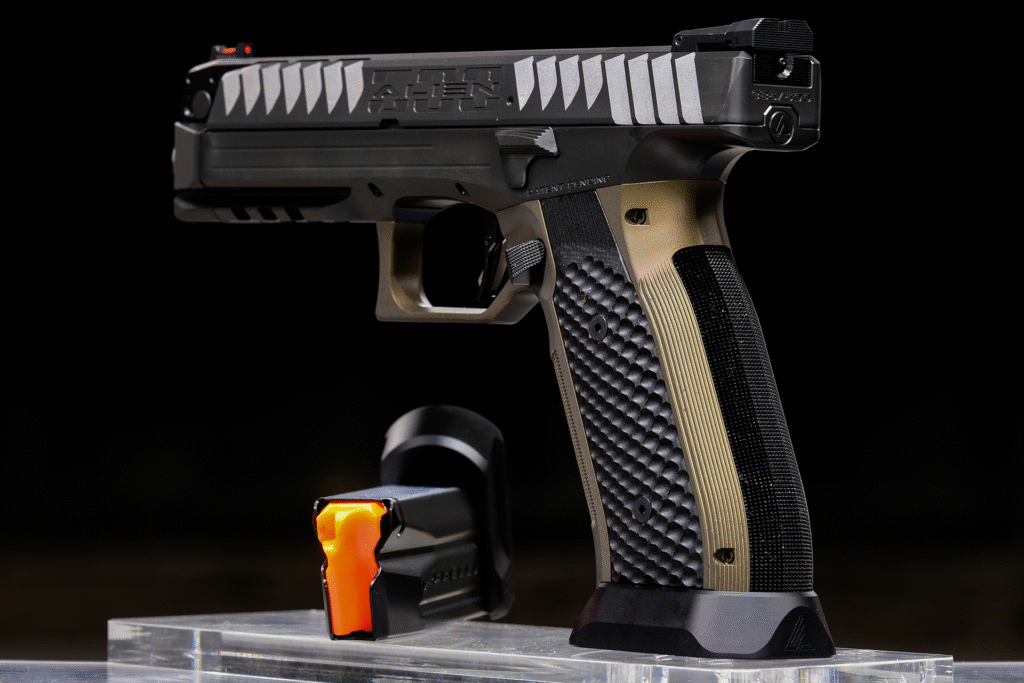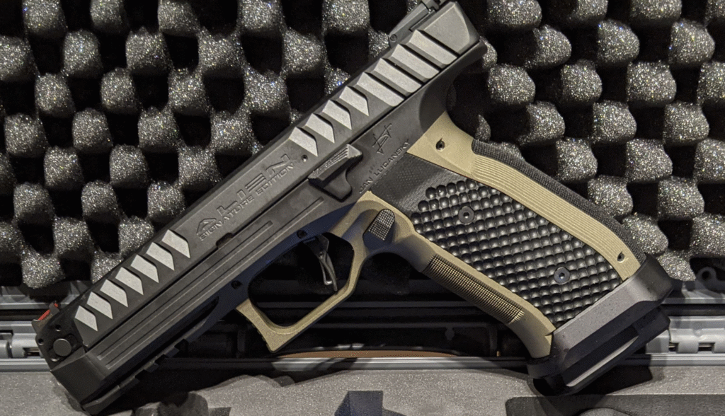 Laugo Arms hasn’t been idle. The Alien has had a number of limited editions and design updates. One of the most prominent is the Alien Creator USA 500 Limited Edition, a production run of just 500 pistols for the US market. These included an exclusive grey-and-rose-gold finish, carbon fiber grip panels, and a complete accessory package—including magazines, optics rails, and holsters.