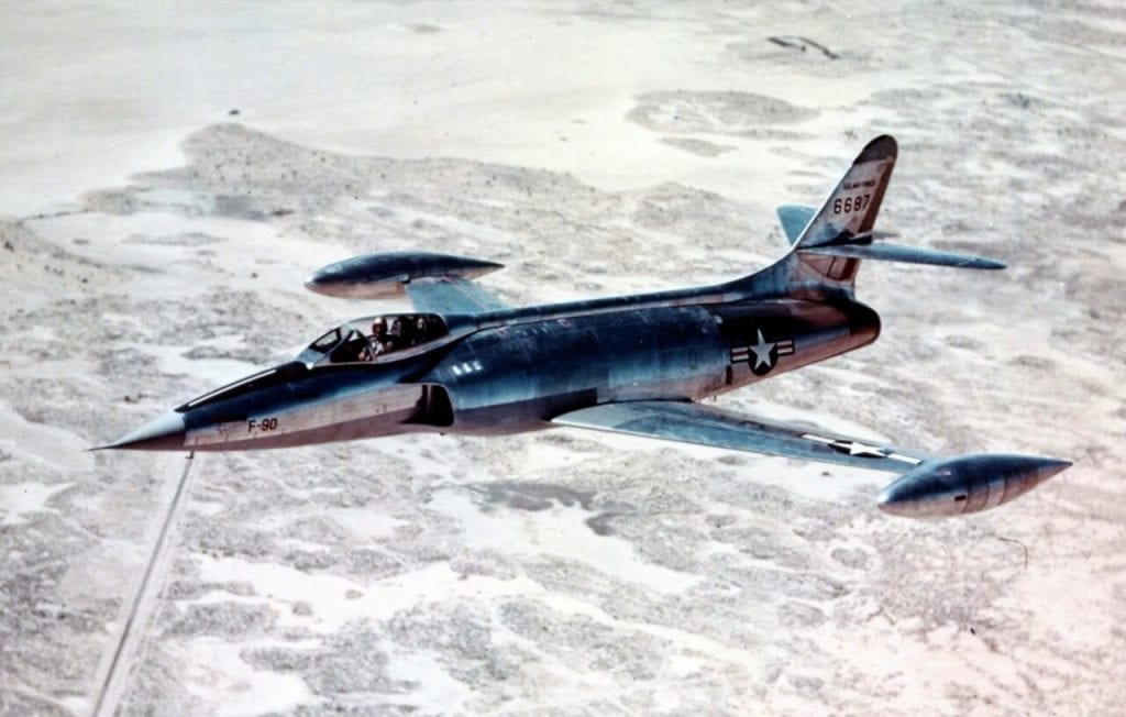 Innovation didn’t come cheap, however. The XF-90 was constructed of 75ST aluminum—much stronger than the standard 24ST—but much heavier as well. Although its airframe could withstand extreme stresses, including the shock of a nuclear explosion, its two Westinghouse J34 turbojets did not have the thrust needed to live up to the potential of the aircraft.