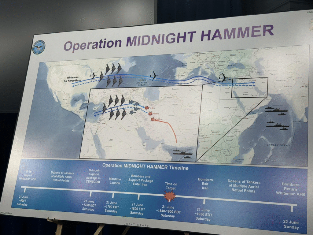 During the operation code-named Midnight Hammer, a fleet of B-2s penetrated deep into Iranian territory, dropping fourteen GBU-57s on Fordow in a closely coordinated attack. Supporting aircraft and cruise missiles widened the assault, highlighting the size and sophistication of the operation.