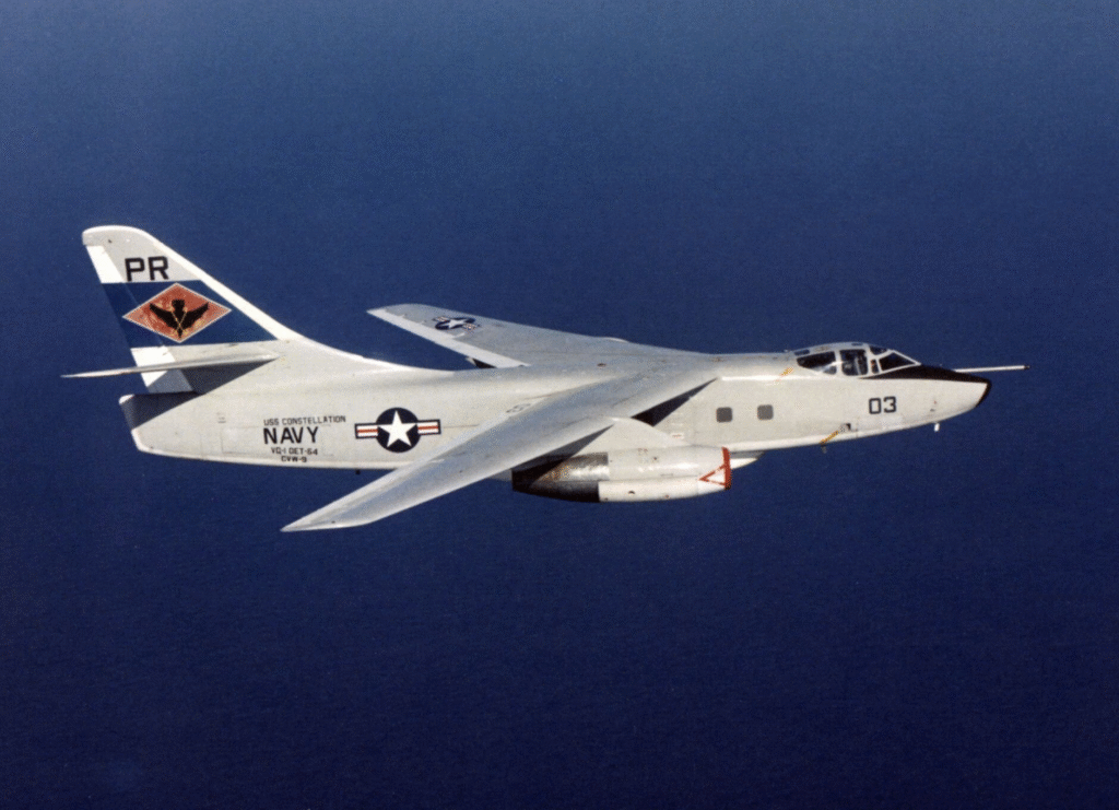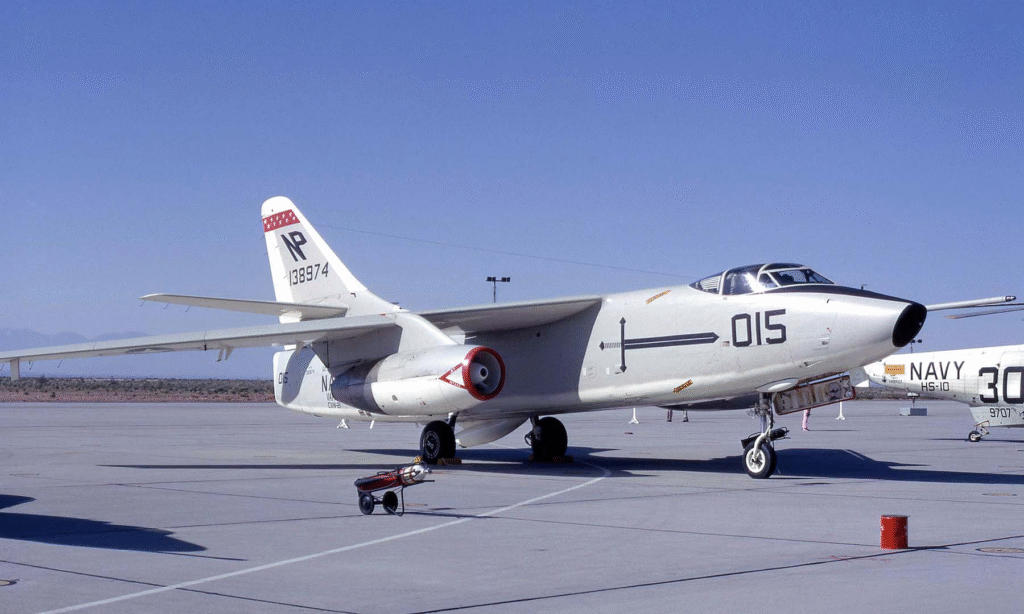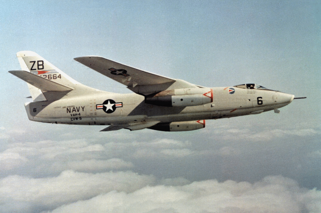 Engineers equipped it with tricycle landing gear to facilitate deck handling, high-mounted folding wings to conserve hangar space, and two hefty Pratt & Whitney J57 turbojets to power the long-range flights it would perform. The cockpit was cramped but serviceable, with the pilot and the bombardier/navigator crammed together and a third crewman facing rearward to man defensive equipment. For weight savings, there were no ejection seats, prompting the cynical crew joke that “A3D” truly stood for “All Three Dead” in a crash.