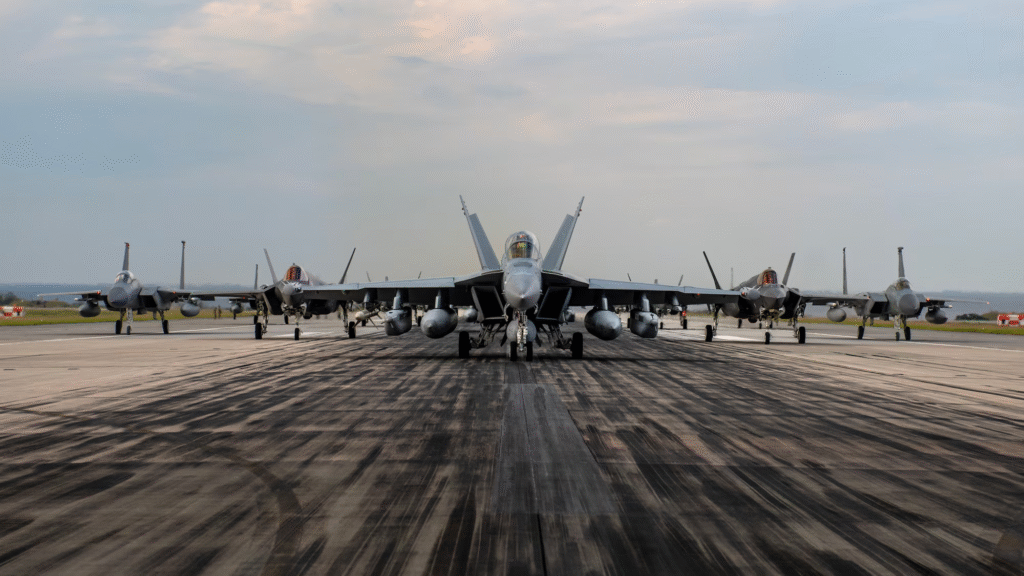 Eight F-15E Strike Eagles from Seymour Johnson Air Base provided serious firepower to the formation. Tailored to deep-strike missions, these dual-role fighters have a heavier payload capacity than the F-35. Combined with stealth aircraft, they form a layered strike force that matches speed, precision, and brute firepower.