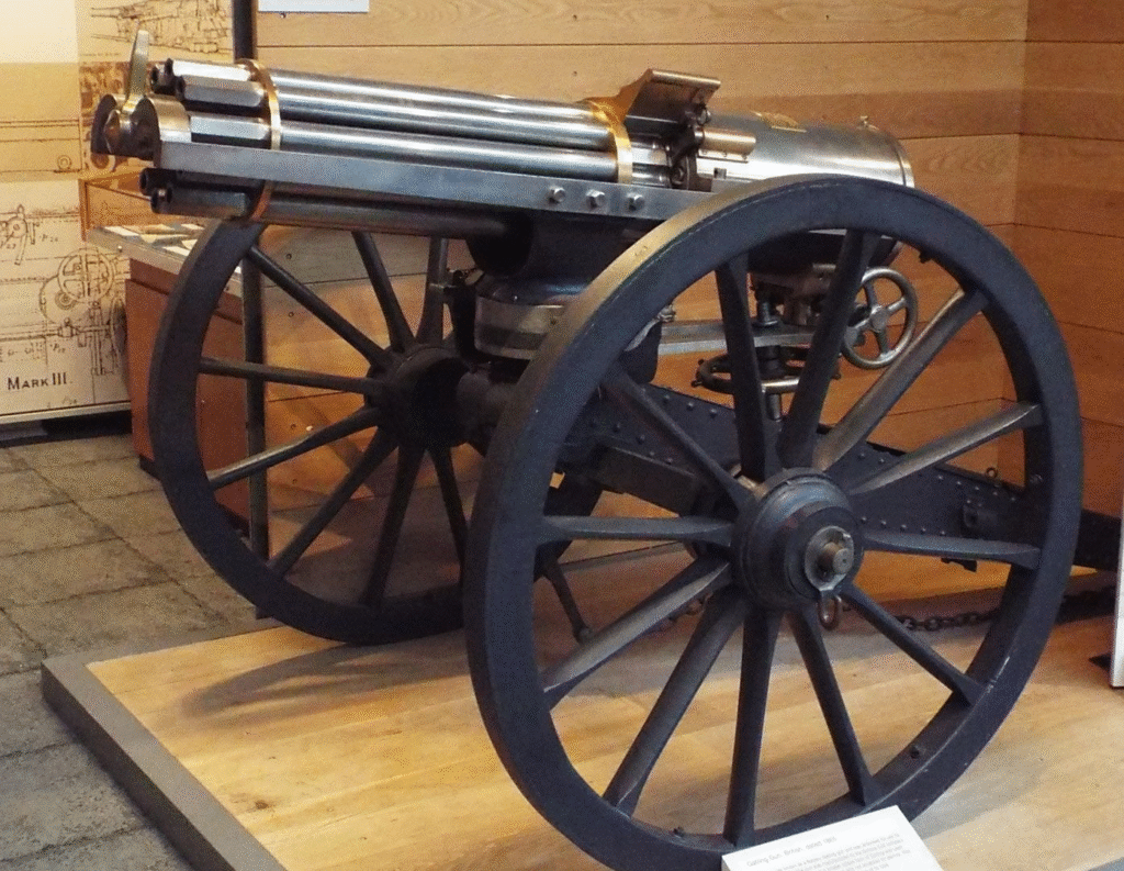 Hiram Maxim’s 1884 invention was the first fully automatic machine gun, using recoil to drive belts of ammunition. This allowed soldiers to fire endlessly on the march, something new and revolutionary at the time. The Maxim gun profoundly changed war, reducing dense infantry units to easy targets and putting an end to cavalry charges. By World War I, it was a standard issue in the military of every nation, completing what the Gatling had started decades before.