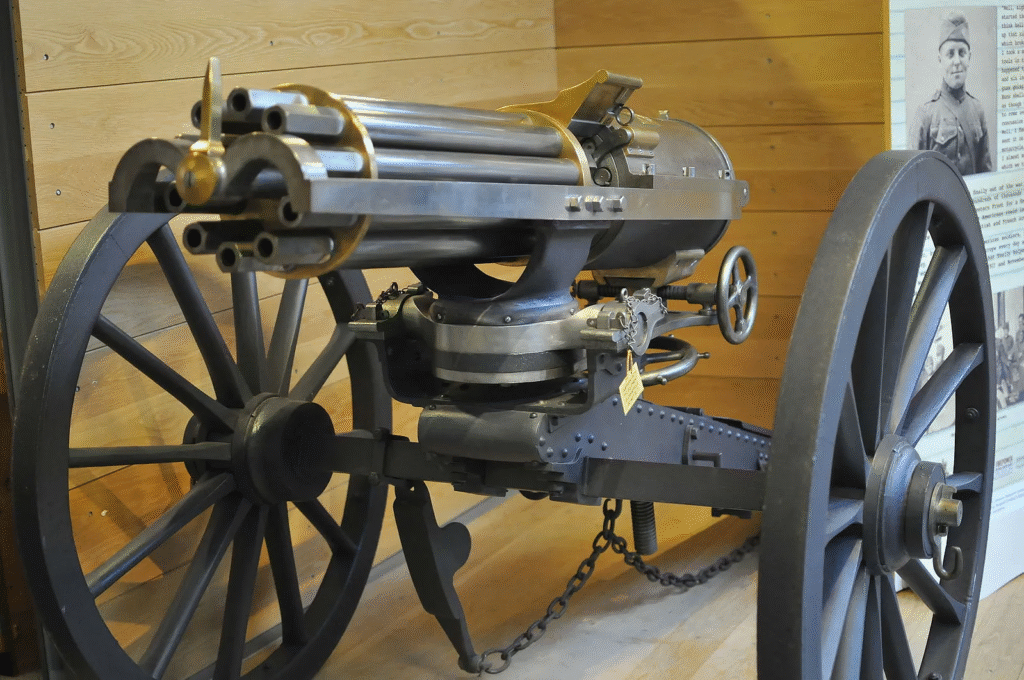 Hiram Maxim’s 1884 invention was the first fully automatic machine gun, using recoil to drive belts of ammunition. This allowed soldiers to fire endlessly on the march, something new and revolutionary at the time. The Maxim gun profoundly changed war, reducing dense infantry units to easy targets and putting an end to cavalry charges. By World War I, it was a standard issue in the military of every nation, completing what the Gatling had started decades before.