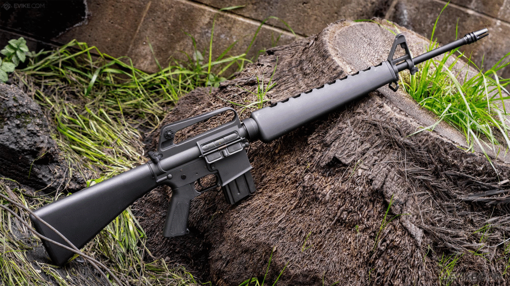 Colt-designed M16 is now the standard-issue for US forces in Vietnam. It’s gas-powered, lightweight, and fires 5.56mm ammunition with semi-automatic, full-auto, or burst modes. Its synthetic stock and efficient gas system made it lighter to carry and use compared to earlier rifles. The new design and fast firing of the M16 have made it a lasting icon of modern American military power.